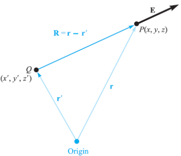 $$ \text{점전하 위치 :} \quad \mathbf{r'} = x' \mathbf{a_x} + y' \mathbf{a_y} + z' \mathbf{a_z} $$ $$ \text{전계를 측정하는 점의 위치:} \quad \mathbf{r} = x \mathbf{a_x} + y \mathbf{a_y} + z \mathbf{a_z} $$ $$ \text{전하 }Q \text{와 측정점 }P \text{사이의 거리 벡터를 } \mathbf{R}\text{ 이라고 하면} $$ $$ \mathbf{R} = \mathbf{r - r'} = (x - x')\mathbf{a_x} + (y - y')\mathbf{a_y} + (z - z')\mathbf{a_z} $$ $$ \mathbf{a_R} = \frac{\mathbf{r - r'}}{|\mathbf{r - r'}|} $$ $$ |\mathbf{R}| = |\mathbf{r - r'}| = \sqrt{(x - x')^2 + (y - y')^2 + (z - z')^2} $$ $$ \mathbf{E} = \frac{1}{4\pi\epsilon_0} \frac{Q}{R^2} \mathbf{a_R} $$ $$ \textbf{And then,} $$ $$ \mathbf{E(r)} = \frac{1}{4\pi\epsilon_0} \frac{Q}{|\mathbf{r - r'}|^2} \frac{\mathbf{r - r'}}{|\mathbf{r - r'}|}= \frac{1}{4\pi\epsilon_0} \frac{Q (\mathbf{r - r'})}{|\mathbf{r - r'}|^3} $$ $$ = \frac{Q}{4\pi\epsilon_0} \frac{[(x - x')\mathbf{a_x} + (y - y')\mathbf{a_y} + (z - z')\mathbf{a_z}]} {\left[ (x - x')^2 + (y - y')^2 + (z - z')^2 \right)]^{\frac{3}{2}}} $$