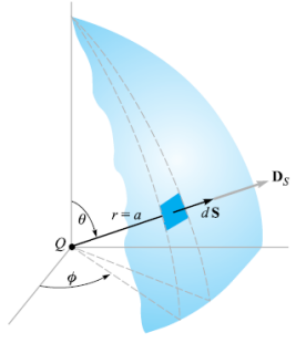 - \( \mathbf{D_s} \bullet d\mathbf{S}=\frac{Q}{4\pi a^2}\mathbf{a_r} \bullet a^2\sin\theta d\theta d\phi\mathbf{a_r} = \frac{Q}{4\pi}\sin\theta d\theta d\phi \)