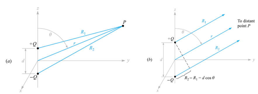 - 점 P가 매우 먼 거리로 멀어지면서 각 지점에서의 거리 \( R_1, R_2, r \) 가 모두 평행하다고 볼 수 있다.